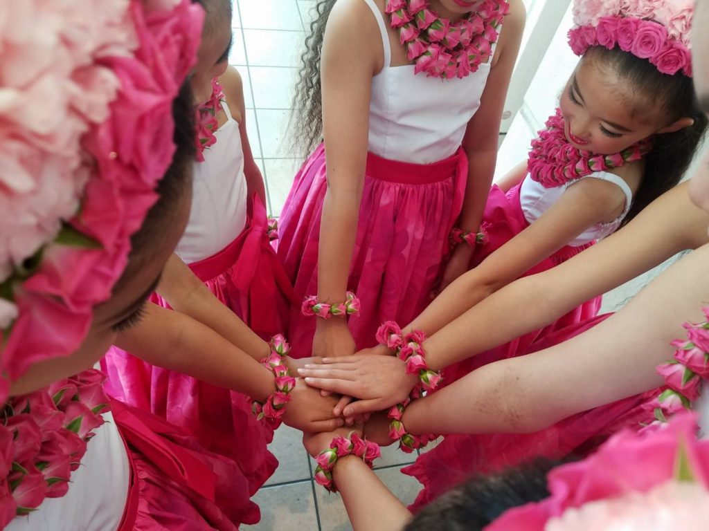 月に3回通っていただくレッスンは、年齢によって3つのクラスに分かれています。3歳からスタートできる【Keiki(ケイキ)】クラスのレッスン時間は1時間。中高生から40歳代の方向けの【Wahine(ワヒネ)】クラスと60歳以上の方のための【Kupuna(クプナ)】クラスは1時間半が1コマになっています。初心者の方や、フラの表現を極めたいという方など、生徒さんそれぞれの目的やペースにあわせてレッスンをお選びください。地元の主婦の方を中心に、母娘で通われている方や、3世代一緒にフラを楽しむ方もいらっしゃるんですよ。何よりもフラは、楽しく踊ることが一番。たくさんの方にフラの魅力を知っていただきたいですね。フラに興味はあるけれど、レッスン代のほかに衣装代など、出費がかさむのでは…と迷われている方がいらっしゃるかも知れません。でも、私たちの衣装はほとんどが手作り。お裁縫が得意なママさんたちのご協力をいただきながら衣装や髪飾りなどを自作することで、生徒さんたちの負担ができるだけ軽くなるようにと考えています。